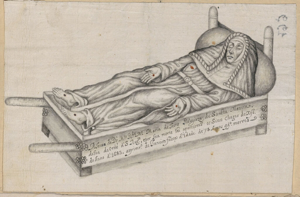 A noticeable element of the present document is the wash drawing attached to the text, which depicts the dead body of Maria de Jesus lying on a bier. The inscription on the bier reads, “The Servant of God, deceased reverend mother Maria de Jesus, religious of Santa Mônica of Goa of the Order of Saint Augustine, and after she died the Five Holy Wounds appeared on her [body]. On the first of January of 1683, she passed away when she was 78” [A serva de Dios muito reverenda mãe Maria de Jesus, religiosa de Santa Mônica de Goa da ordem do Santo Augusto, e por sua morte lhe aparecerão os cinco chagas de Cristo. Do ano de 1683 ao primeiro de janeiro faleceu de idade de 78 anos quando morreu]. The visual representation is made with great detail. It is remarkable that this visual representation post mortem of Maria de Jesus clearly indicates the five marks on the body: three in red color and the rest two on feet in carbon color.
