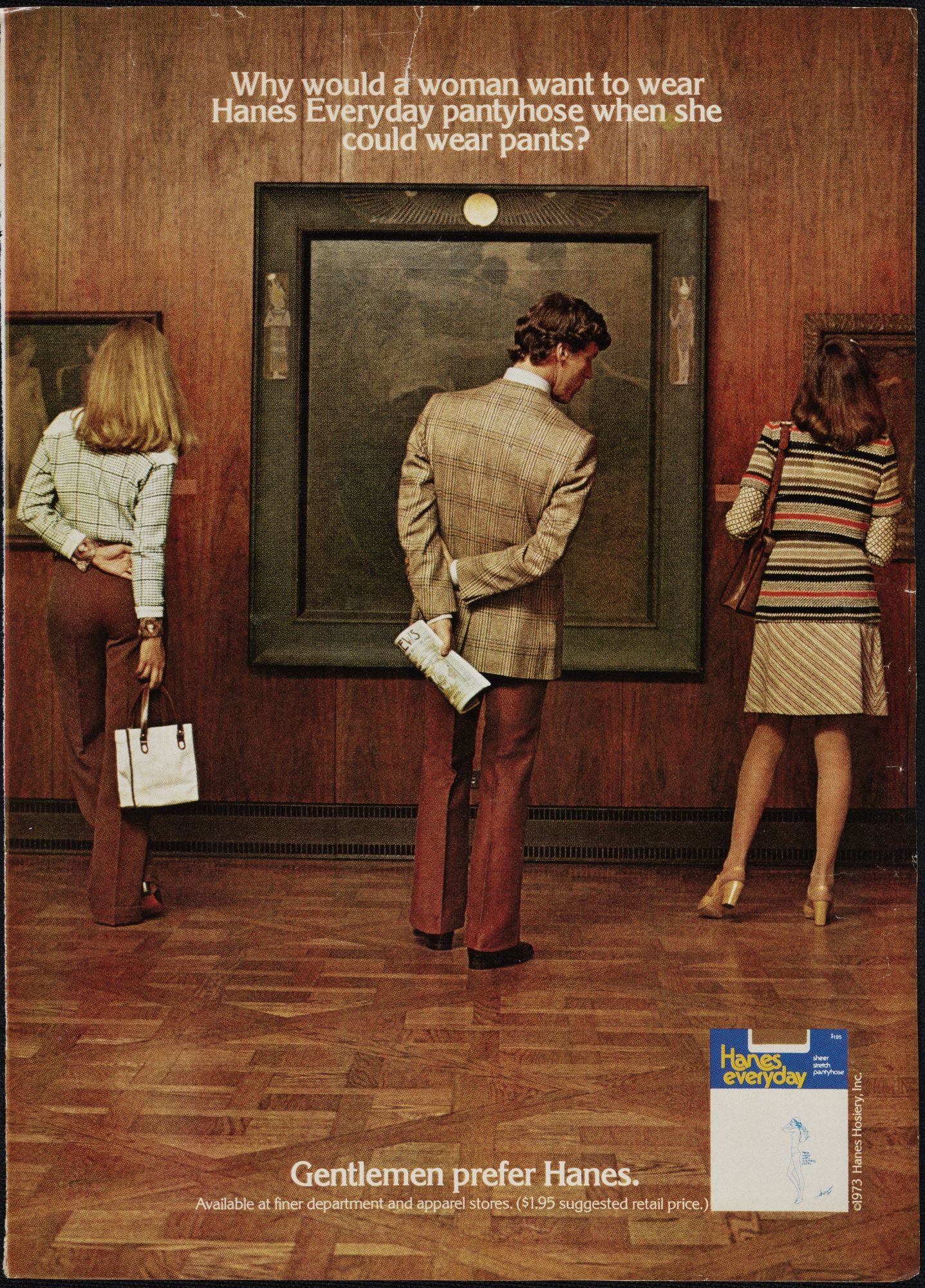 In the 1970s and 1980s, second wave feminism made pants much more common for women, but much of the media and society still discouraged them from wearing them, albeit in comparatively subtler ways. The “Gentlemen Prefer Hanes” ad campaign, which included commercials in addition to print ads, featured men openly staring at women’s legs in skirts, something portrayed as positive rather than problematic. Within the context of the Women’s Liberation Movement, ads like these sent the message that women should not pursue their own desires and should prioritize men’s instead.