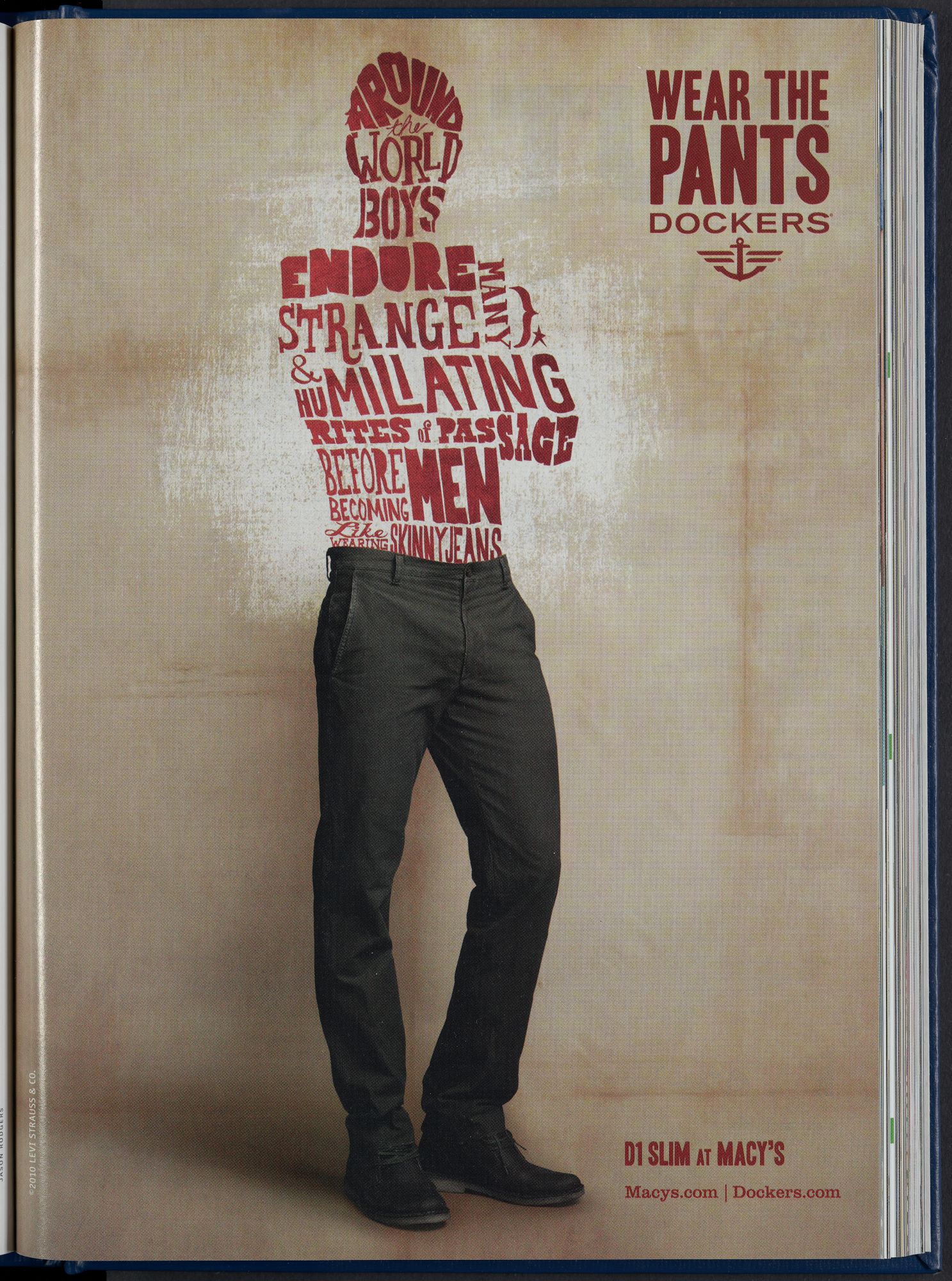 In 2009 and 2010, Dockers ran a controversial ad campaign encouraging men to “wear the pants,” alongside text that associated wearing Dockers work pants with masculinity, demonstrating the lingering link between manliness and pants in our own century. As wearing pants became more normalized for women, a distinction was instead drawn between men’s and women’s pants, with skinny jeans—as seen in this Docker’s ad—becoming “humiliating” because of their association with femininity. Here, masculinity is also directly linked with maturity—Dockers are for “men,” while skinny jeans are for “boys.” Within the larger ad campaign, this was one of many different messages Dockers communicated centered on the theme of men needing to wear styles deemed “masculine” in order to be men.