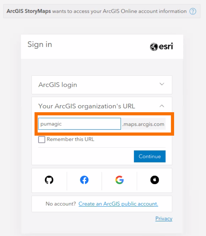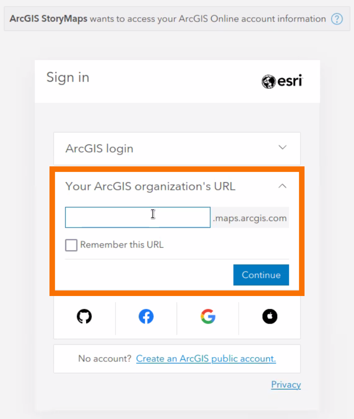 Select the "Your ArcGIS organization's URL" (The second drop-down option, below "ArcGIS login").