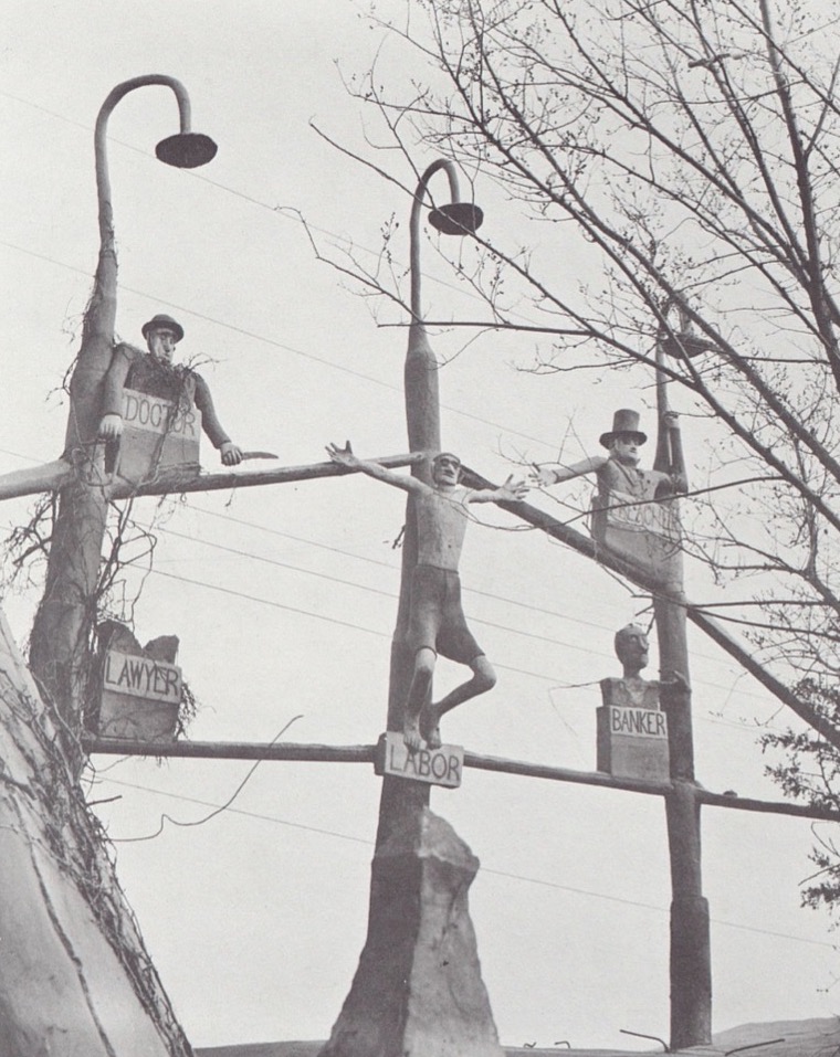 This pro-worker, Marxist message is also apparent visually. The June 1973 issue of Arsenal features a series of photographs by SP Dinsmoor titled The Garden of Eden. A veteran of the American Civil War, Dinsmoor built a garden out of cement next to his cabin in Lucas, Kansas. Labor Crucified depicts one of the installations in his garden: mannequin busts labeled “doctor,” “lawyer,” “preacher,” and “banker” are tied on lampposts as tall as the trees. In the middle of the four busts stands a full-size mannequin with its arms stretched out and tied to the intersection of two poles, resembling the crucifixion of Jesus Christ. This dummy is labeled “labor.” In the text that accompanies the image, Dinsmoor writes, “The Preacher is saying to this poor fellow crucified, ‘Never mind your suffering here on earth, my friend, never mind your suffering here, secure home in heaven for A-l-l E-t-e-r-n-i-t-y and you’ll be alright’” (Arsenal 2: Surrealist Subversion 1973). In this photograph, Dinsmoor first compares the experience of the wage laborer to that of Jesus’s crucifixion, one that is akin to punishment and suffering. This is consistent with the political positions of the Chicago group, but also with surrealism’s predilection for outsider art, art created by practitioners beyond the art institution, as Dinsmoor was.